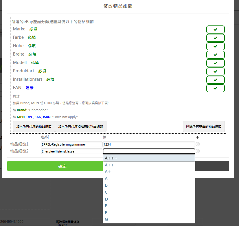 进入数据表,在“基本资料”找到物品细节,添加EPREL注册编号或能效等级