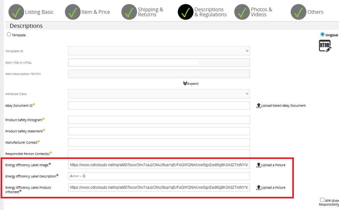 In the "Description and Regulations" section, find the energy efficiency label image, energy efficiency label description, and energy efficiency label product information sheet, and add them one by one.