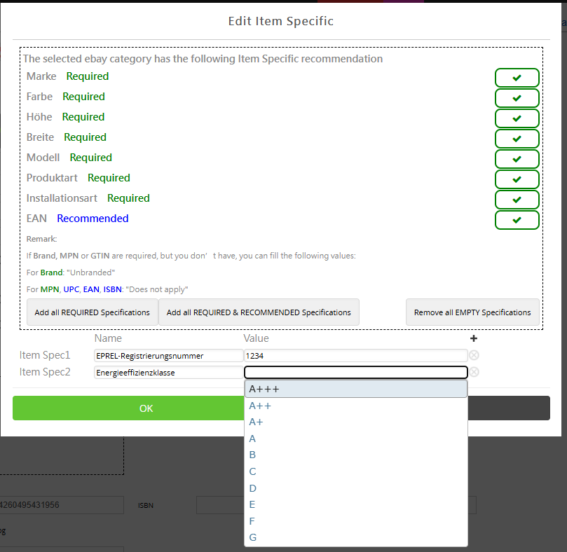 Edit your datasheet, find the item specific in "Basic Information," and add EPREL registration number and the energy efficiency rating.