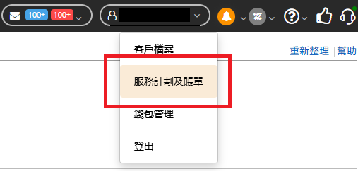 点击系统右上角的用户名,从下拉菜单中进入“服务计划及账单”