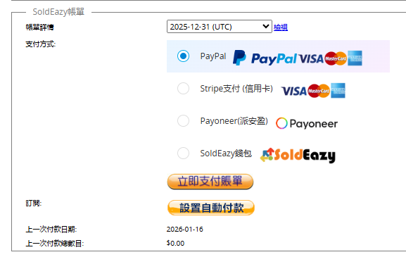 在“SoldEazy账单”分区之下,可以选择付款方式,目前系统支持4种在线付款方式:PayPal,信用卡,Payoneer,SoldEazy钱包 你也可以订阅自动付款,设置在线付款方式之后,下次出账单时会自动扣款