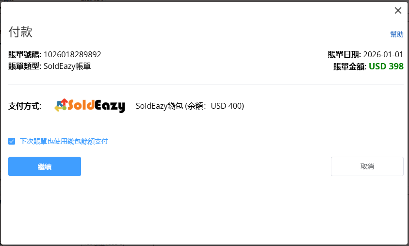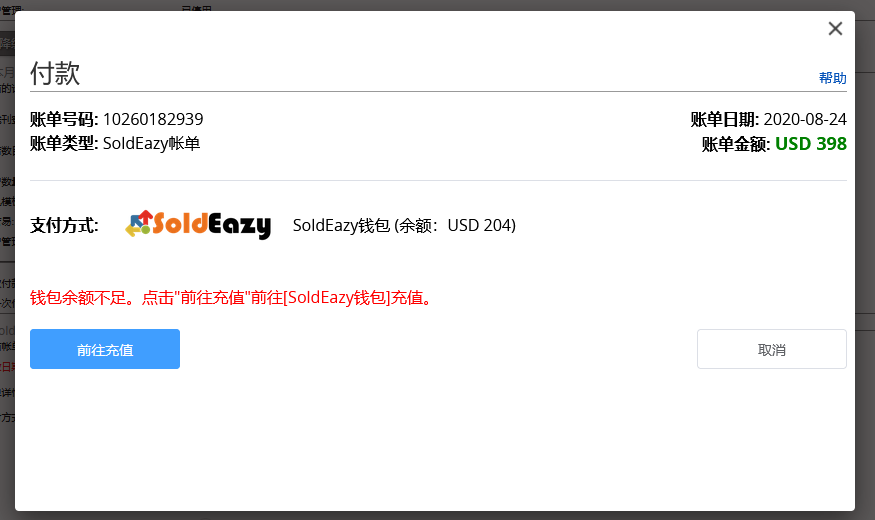 用户也可以勾选“下次账单也使用钱包余额支付”,下次出账单时系统会自动扣款。 2. 如果余额不足以支付本期账单,可以点按「前往充值」到SoldEazy钱包充值